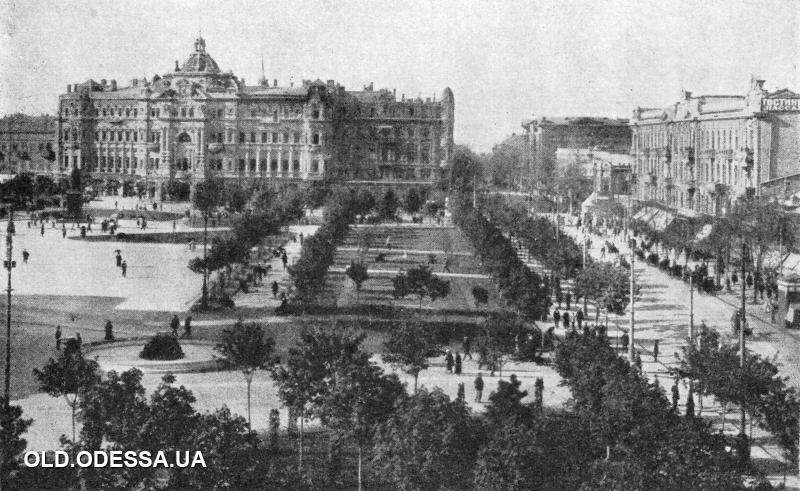 According to the original city plan, which was developed by Lieutenant Colonel Devolan, the square had a circular shape and was named Katerynynska because, at the city’s foundation, the Military Church of Saint Catherine, the heavenly patroness of the Empress, was laid there. After the Empress’s death in November 1796, construction of the church, as well as of all Odesa, was suspended by Paul I. In 1821, the unfinished church was dismantled. A garden square was arranged in the center of the square, where later, in 1873, after the Dniester water pipeline was launched, a fountain (the first in the city) was installed. Later, this fountain “moved” to its permanent “residence” in the City Garden.