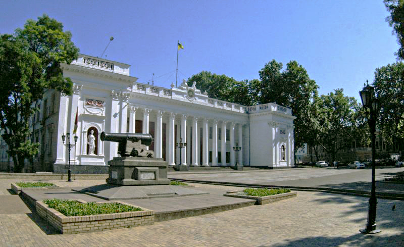 Throughout its history, the square has been called Exchange Square, Dumska Square, Commune Square, then again Dumska Square, and since 2024 it has returned to its first historical name—Exchange Square—because the current building of the Odesa City Council was built in 1834 for the Merchant Exchange. Architect Francesco Boffo designed it in the classical style in the shape of an elongated “П”; two wings of the building were connected by a double colonnade, and behind it there was an inner courtyard. In the course of later renovations, the courtyard became the vestibule, and only the outer row of columns remained.