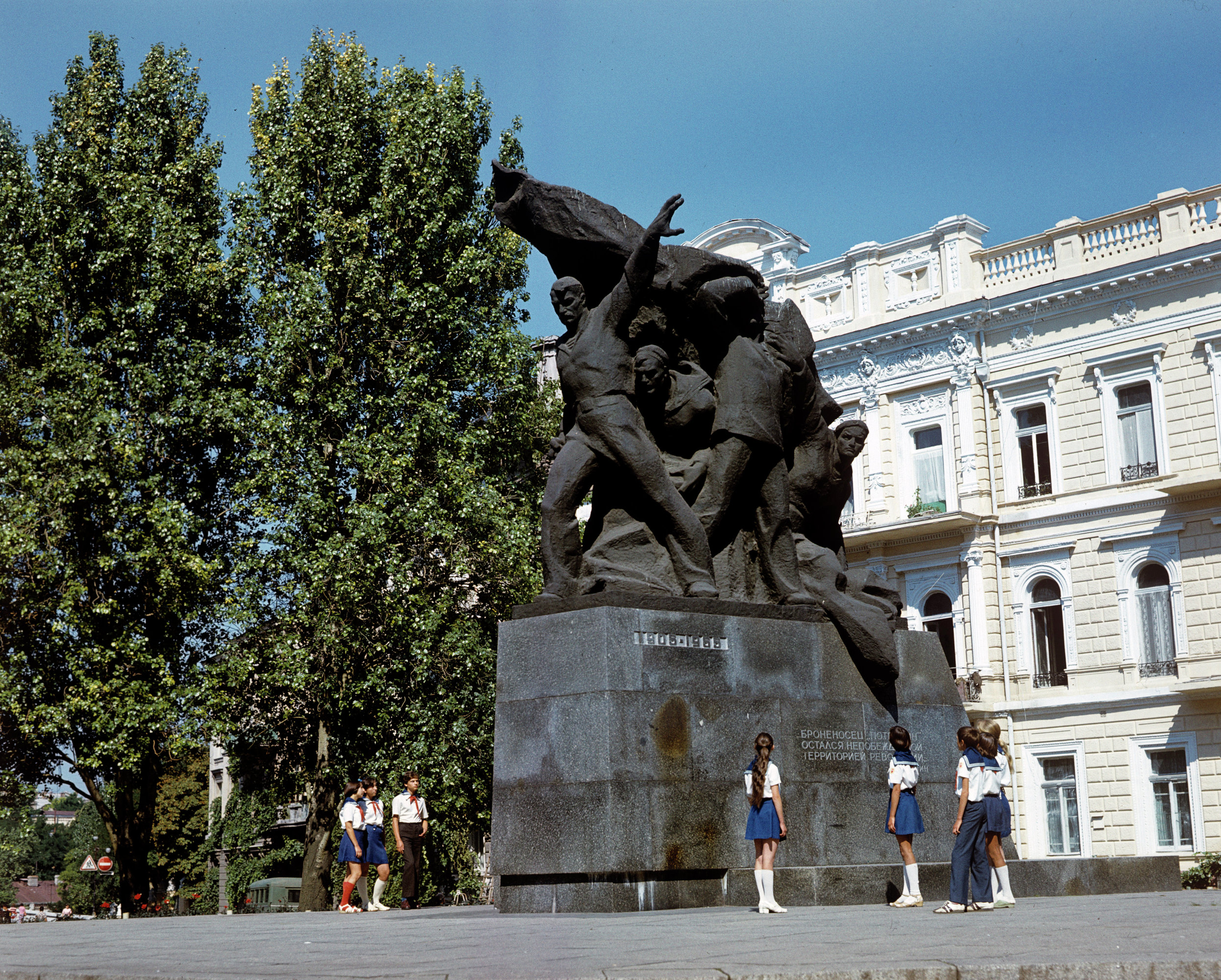 On June 27, 1965, on the 60th anniversary of the uprising on the battleship Potemkin, the unveiling of the monument to the Potemkin sailors took place on the square, attended by a group of veterans of the uprising. The authors of the monument were Muscovites – sculptor V. A. Bogdanov, architects M. M. Volkov and Yu. S. Lapin.