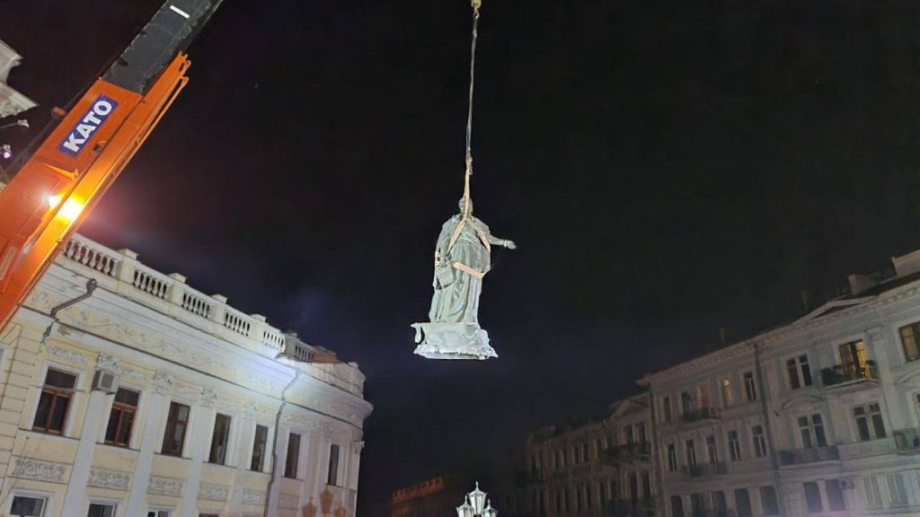 In 2022, after the treacherous attack of the Russian aggressor on Ukraine, the fate of the monument “To the Founders of Odesa” was decided by Odesa residents through electronic voting, which ended on October 20. The majority of votes – 3,914 – were cast for the option “to completely dismantle the monument.” On the night of December 28–29, the monument to Catherine II was dismantled. The dismantling of the monument, officially named “To the Founders of Odesa,” began at about 11:00 p.m. and lasted almost three hours. First, the sculptures of her favorites were removed from the monument and transferred to a truck with the help of a crane. Then the same was done with the sculpture of Catherine II. After the dismantling, the sculptures from Katerynynska Square were delivered to the Odesa Fine Arts Museum, where they are to remain temporarily according to the decision of the executive committee of the Odesa City Council dated November 30, 2022.