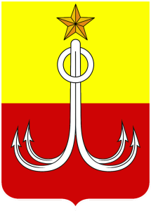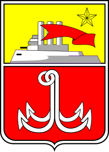 У червоному заокругленому щиті — срібний якір «Кішка» з чотирма лапами. Щит укладений в золотий стилізований картуш і увінчаний золотою міською короною з трьома зубцями, під якою — п’ятипроменева Золота Зірка міста-героя, гранована золотом і діамантом.