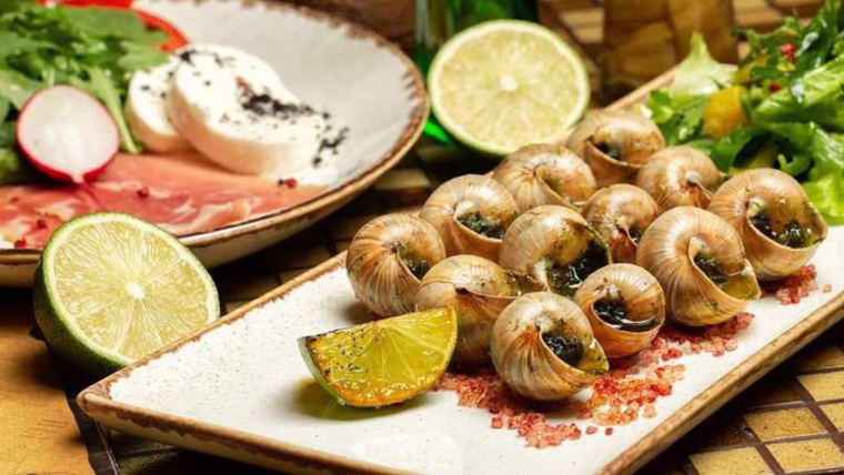 Składniki: filet ze ślimaka, masło, białe wino, pieprz, sól, pietruszka, koper, seler, czosnek, cebula, cytryna, imbir, parmezan.